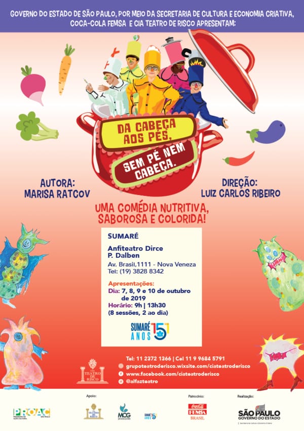 Uma comédia nutritiva, saborosa e colorida! É o espetáculo ‘Da Cabeça aos Pés, Sem Pé Nem Cabeça’ que Sumaré recebe em outubro, no Anfiteatro Dirce Dalben. O musical infantil tem o apoio da Secretaria Estadual de Cultura e Economia Criativa, Coca-Cola Femsa e da Prefeitura de Sumaré. A peça da Cia Teatro de Risco tem entrada gratuita, e retrata, de forma divertida, lúdica e educativa, a importância de as crianças manterem uma alimentação saudável e bons hábitos de higiene pessoal.