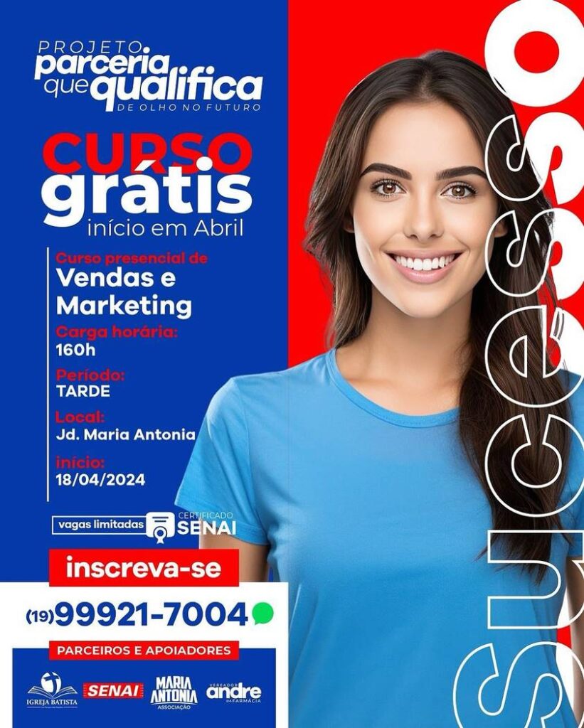 O SENAI Sumaré, em parceria com o projeto ‘Parceria que Qualifica’, está com inscrições abertas para o curso presencial e gratuito de Vendas e Marketing na região do Maria Antonia. As vagas são limitadas.