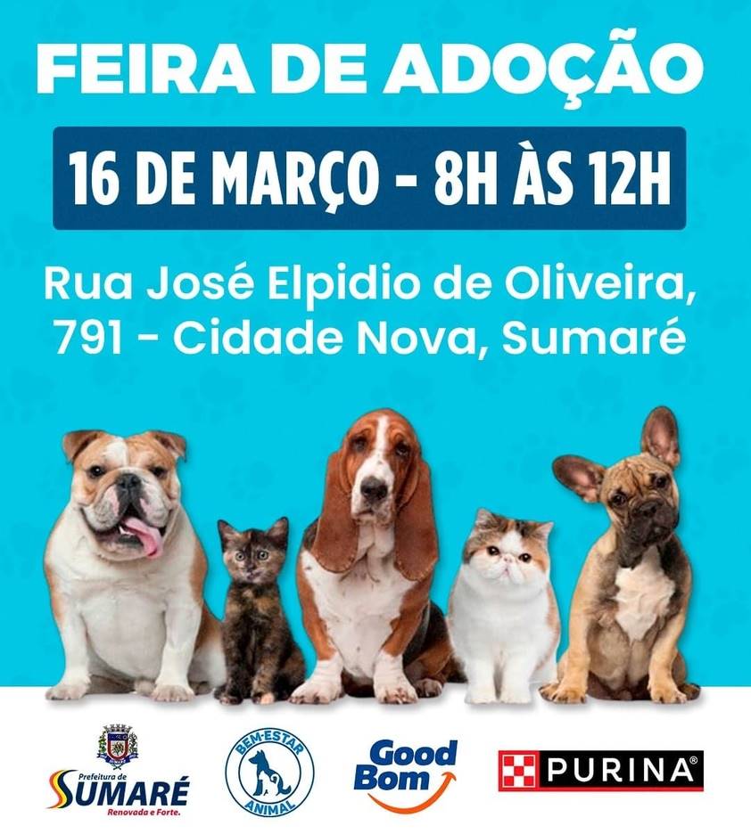 A feira de adoção será realizada na Rua José Elpídio de Oliveira, 791, Cidade Nova, Sumaré/SP.