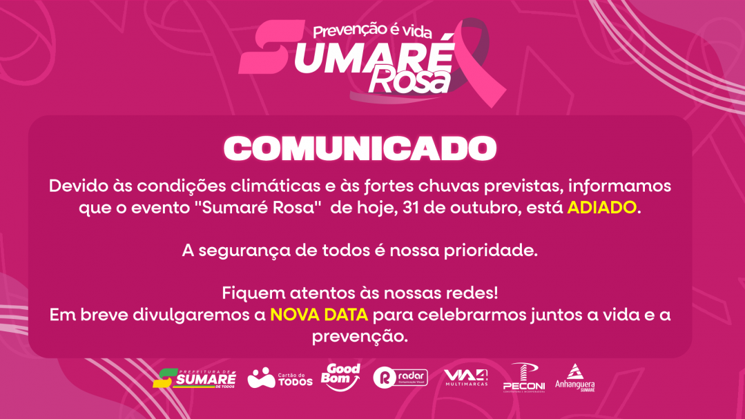A Prefeitura de Sumaré informa que o evento alusivo à campanha Outubro Rosa, programado para acontecer nesta sexta-feira(31), foi adiado em função das fortes chuvas registradas na cidade. A decisão prioriza a segurança e o bem-estar de todos os participantes, parceiros, equipes e da comunidade.