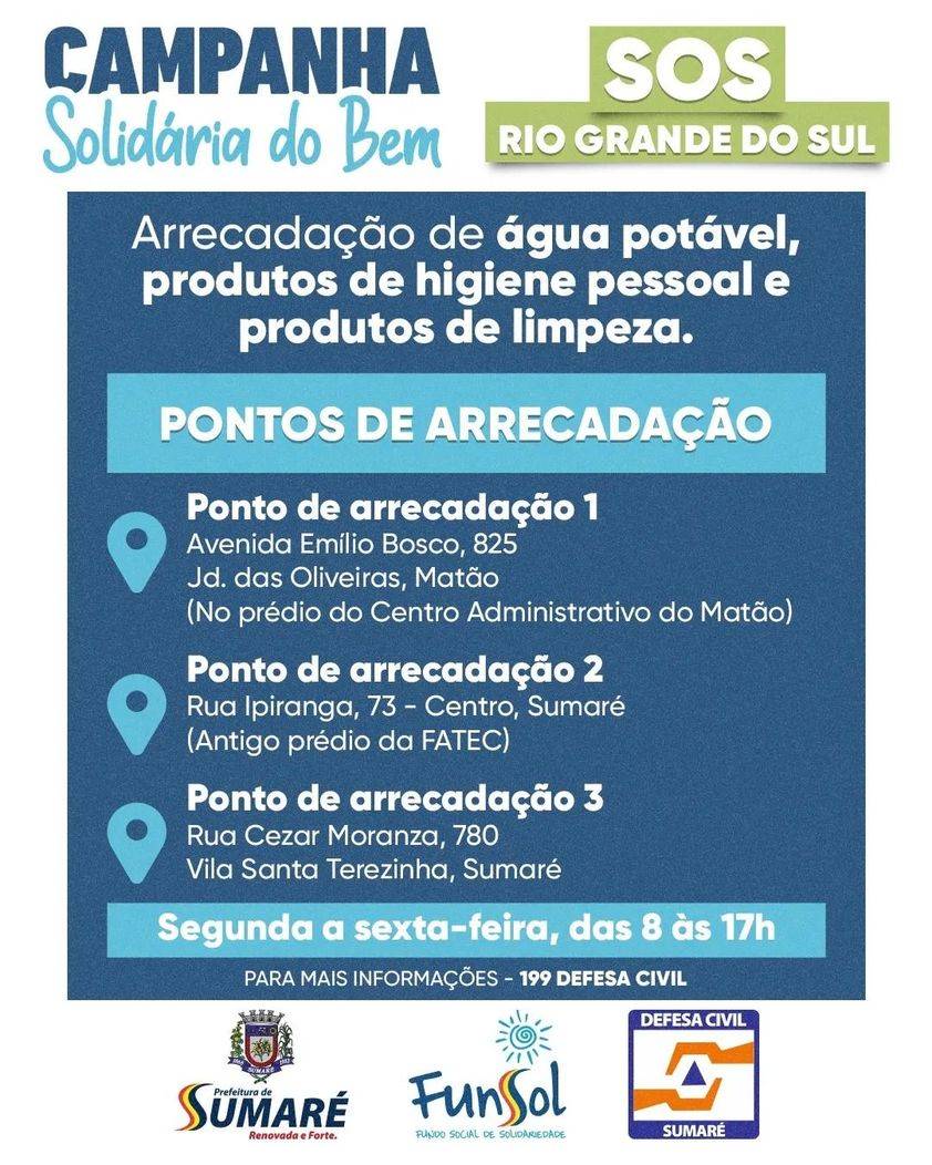Como forma de solidariedade à população do Rio Grande do Sul, que enfrentou desastres naturais em várias regiões, a Prefeitura de Sumaré está promovendo uma campanha de arrecadação de água potável, produtos de higiene e limpeza em colaboração com o Fundo Social de Solidariedade e a Defesa Civil.