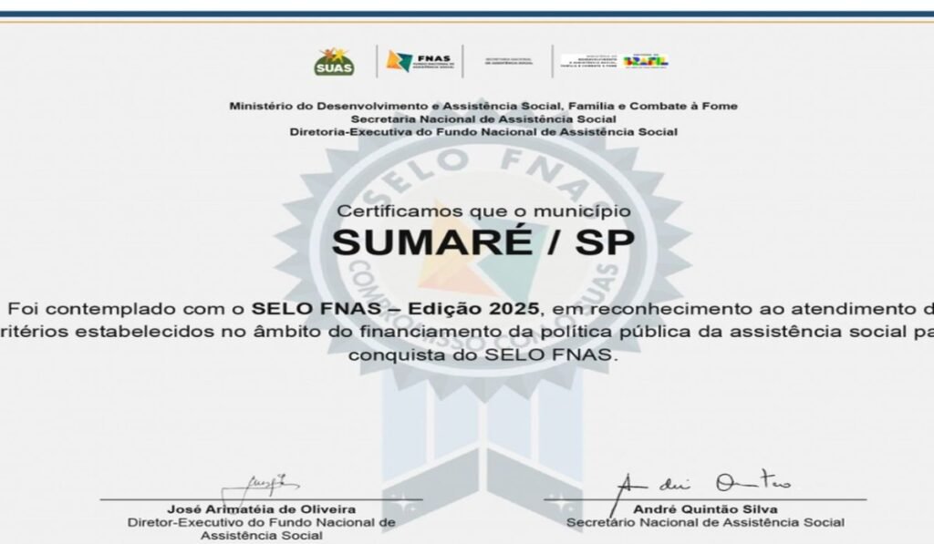A Prefeitura de Sumaré, por meio da Secretaria Municipal de Inclusão, Assistência e Desenvolvimento Social, conquistou o SELO FNAS – Edição 2025, reconhecimento de âmbito nacional concedido pelo Fundo Nacional de Assistência Social, órgão responsável pelo repasse e gestão de recursos destinados ao financiamento das políticas públicas de assistência social em todo o país.