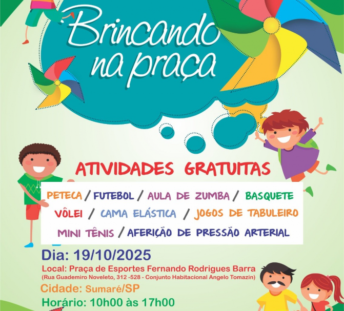 Sumaré será tomada pela alegria e energia do “Brincando na Praça”, que chega à sua segunda edição de 2025 neste domingo, dia 19 de outubro, das 10h às 17h, na Praça de Esportes Fernando Rodrigues Barra, localizada na Rua Guademiro Noveleto, 312-528 (Conjunto Habitacional Ângelo Tomazin) na região do Maria Antonia.