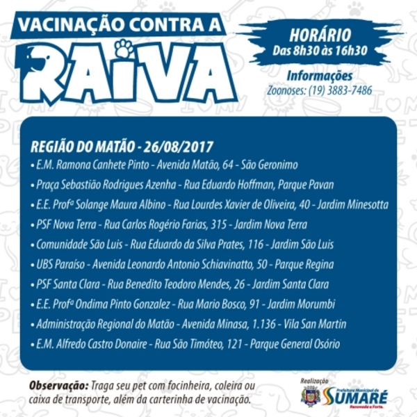Sumaré, 24 de agosto de 2017. A Campanha Municipal de Vacinação Antirrábica para cães e gatos com idade superior a quatro meses, promovida …