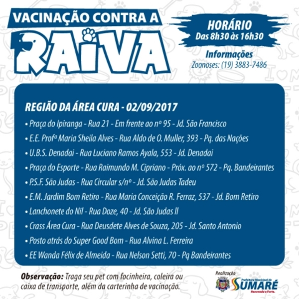 Sumaré, 31 de agosto de 2017. A Prefeitura de Sumaré ampliou para dez (antes eram oito) o número de postos de vacinação contra a raiva …
