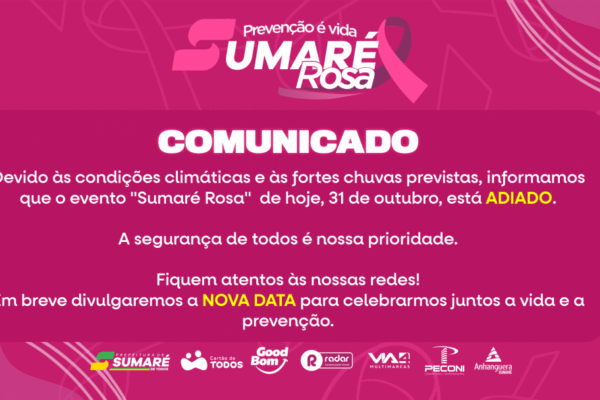 A Prefeitura de Sumaré informa que o evento alusivo à campanha Outubro Rosa, programado para acontecer nesta sexta-feira(31), foi adiado em função das fortes chuvas …